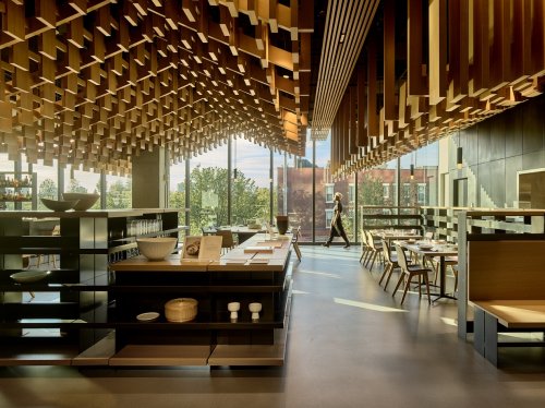 二层空间则承载着更丰富的文化内涵。这里设有由韩国文化机构Onjium主理的餐厅,融合韩国传统饮食哲学与现代料理形式,为宾客提供独特的味觉体验。开放的用餐区可眺望高线与哈德逊河,墙面以天然木材与铜质饰面打造,呈现温润而克制的东方气质。与其说这是餐厅,不如说是品牌“Son-nim”待客之道的延伸,让宾客在舒适、体贴的氛围中理解捷尼赛思的文化底色。